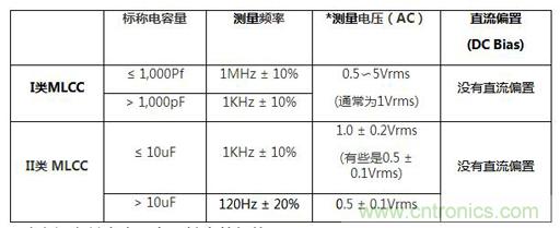 I類和II類MLCC電容的實際測量頻率和電壓各有不同。如I類MLCC產品,以KemetC0402C330J3GACTU為例,它的測量頻率為1MHz±10%,測量交流電壓為1.0±0.2Vrms。II類MLCC產品,如Samsung CL03A225MP3CRNC,它的測量測量頻率為1KHz±10%,測量交流電壓為 0.5 ± 0.1Vrms。