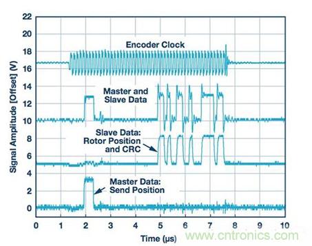 圖6顯示了EnDat系統(tǒng)的測試結(jié)果。測試使用的時鐘頻率為8 MHz,延遲補(bǔ)償通過接收時鐘相移實現(xiàn)。底部信號是來自EnDat主機(jī)的命令。此處顯示的命令為“發(fā)送位置”,其前面是兩個0,接著是六個1,最后又是兩個0。該命令總共有10位。編碼器的響應(yīng)是從頂部起的第三個信號。合并數(shù)據(jù)線是從頂部起的第二個信號。最后,頂部信號是施加于編碼器的時鐘。