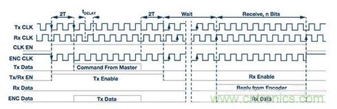 來自處理器的時鐘信號是連續(xù)的,而EnDat協(xié)議規(guī)定,時鐘只能在通信期間施加于編碼器。在所有其他時候,時鐘線路必須保持高電平。為此,處理器產(chǎn)生一個時鐘使能信號CLK EN,其被送至ADM3065E數(shù)據(jù)使能引腳。恰好兩個時鐘周期(2T)之后,主機(jī)開始在Tx DATA上發(fā)出命令。