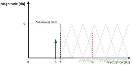大多數ADC之前都會有一個抗混疊濾波器,而這個濾波器與衰減信號(超過了所需帶寬)的低通濾波器沒有什么不同。如圖4所示,一個理想抗混疊濾波器的響應在那奎斯特頻率之前是絕對水平的,在這個頻率之后,它迅速滾降,以衰減帶外頻率。在這里,采樣率已加倍至14SPS,這將7Hz的那奎斯特頻率和原始6Hz輸入安全的放置在通頻帶之內。