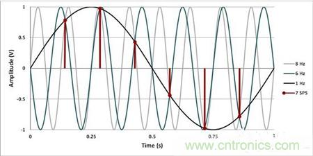 為了準確地測量輸入正弦波,采樣率必須滿足那奎斯特采樣標準。在上面的示例中,你需要將采樣率至少增加到12SPS。恰恰在12SPS時,6Hz輸入將仍然折返至DC,并且會在測量值中增加一個偏移,所以,采樣只快了一點點,確保你所需要的信號根本就不會發生混疊。