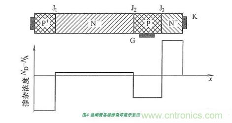 晶閘管各部分的摻雜濃度如圖4所示。其中與陽極和陰極相連的分別為重摻雜的P+和N+層,與門極相連的重摻雜P+層,此三層的厚度(在圖中體現為寬度)都較小,剩下的一層為相對輕摻雜的層N-層,其厚度較大,而厚度較大的輕摻雜對器件的耐壓和通態特性都有顯著的影響。