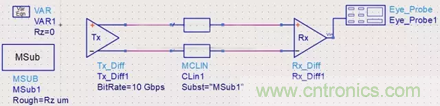 前面說到,銅箔的粗糙度會影響到信號完整性,那么我們就來做一個實驗看看。原理圖如下所示,把銅箔粗糙度的設置為一個變量,初始值為0,仿真的速率為10Gbps: