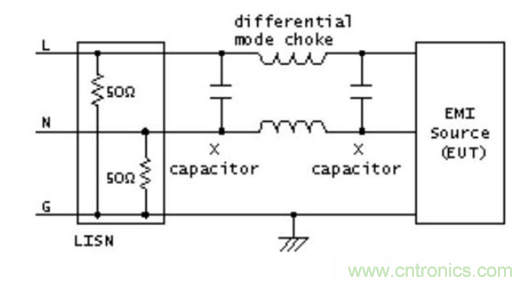 電容的作用是將高頻干擾電壓“短路”,另外,當(dāng)干擾信號(hào)頻率很高時(shí),抑制線圈將產(chǎn)生很大的交流阻抗。圖2顯示了兩種濾波類型的結(jié)構(gòu),其中,LISN是用于測(cè)量目的的線性阻抗穩(wěn)定網(wǎng)絡(luò)。如果是共模問題引起的干擾,X類型電容基本上沒有作用,因?yàn)閮删€上的干擾電壓是一樣的。因此,了解干擾類型對(duì)于選擇合理的電路結(jié)構(gòu)將起重要作用,并為解決問題提供技術(shù)依據(jù)。
