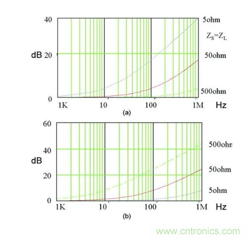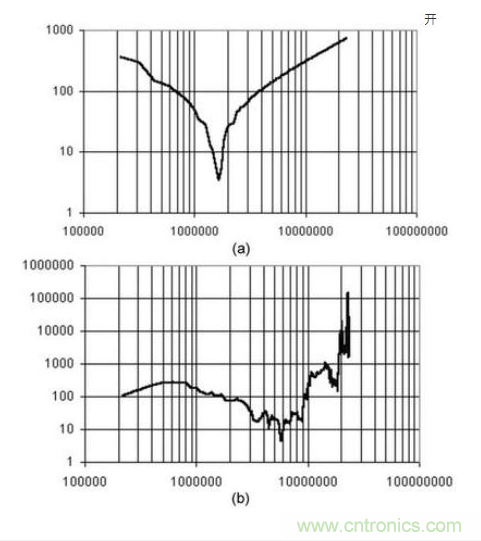 上面的例子說明,選擇一個(gè)具有很高插損的濾波器也不能很好抑制傳導(dǎo)噪聲的原因是,電源輸入端阻抗的影響。因此,設(shè)計(jì)者除了選擇一個(gè)合適的濾波器之外,還需要了解電源的阻抗特性、共模阻抗和差模阻抗。阻抗測(cè)試可以借助專用的阻抗測(cè)試儀或者傳導(dǎo)分析儀。一種濾波器的共模阻抗(a)和差模阻抗(b)的變化如圖5所示。