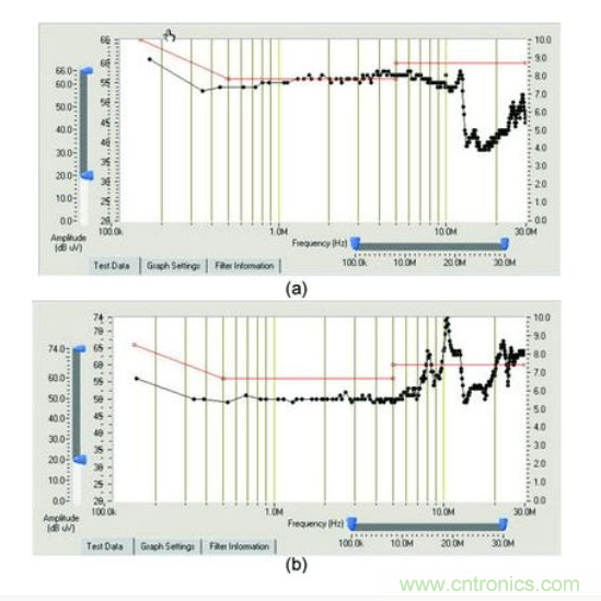 在標(biāo)準(zhǔn)電磁兼容性測(cè)試實(shí)驗(yàn)室可得到設(shè)備的總干擾情況,但無法了解設(shè)備的共模干擾和差模干擾特性。為了在測(cè)量中分辨共模或者差模干擾信號(hào),通用的儀器是很難實(shí)現(xiàn)的。使用專用的傳導(dǎo)測(cè)試儀,可獲得設(shè)備的總干擾、共模干擾和差模干擾。測(cè)試結(jié)果如圖3所示。