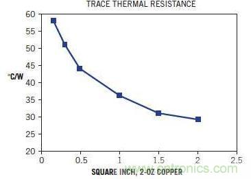 圖3:您可以表示2盎司銅印刷電路板走線的熱阻,單位為攝氏度/瓦,與走線面積的函數關系。這種厚度的銅是大多數印刷電路板的典型特征。