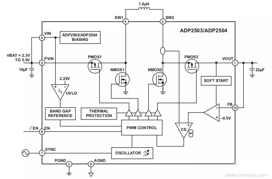 這樣的器件譬如ADI公司的ADP2503和ADP2504降壓-升壓轉(zhuǎn)換器,它們內(nèi)置四個(gè)開關(guān)、兩個(gè)電容和一個(gè)電感。