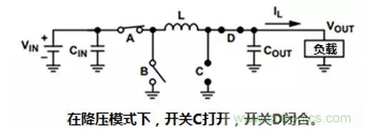 在降壓模式下, 降壓-升壓轉(zhuǎn)換器工作如下圖,Vin大于Vout時(shí),開關(guān)C打開,開關(guān)D閉合。