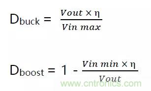 所以要計(jì)算降壓模式的最小占空比和升壓模式的最大占空比。這些占空比很重要,因?yàn)樵谶@些占空比下,可以知道轉(zhuǎn)換器工作范圍的極限。占空比總是正數(shù)且小于1。
