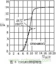 COOLMOS的最大特點(diǎn)之一就是它具有短路安全工作區(qū)(SCSOA),而常規(guī)MOS不具備這個(gè)特性。COOLMOS的SCSOA的獲得主要是由于轉(zhuǎn)移特性的變化和管芯熱阻降低。COOLMOS的轉(zhuǎn)移特性如圖6所示。從圖6可以看到,當(dāng)VGS>8V 時(shí),COOLMOS的漏極電流不再增加,呈恒流狀態(tài)。特別是在結(jié)溫升高時(shí),恒流值下降,在最高結(jié)溫時(shí),約為ID25℃的2倍,即正常工作電流的3-3.5 倍。在短路狀態(tài)下,漏極電流不會(huì)因柵極的15V驅(qū)動(dòng)電壓而上升到不可容忍的十幾倍的ID25℃,使COOLMOS在短路時(shí)所耗散的功率限制在 350V×2ID25℃,盡可能地減少短路時(shí)管芯發(fā)熱。管芯熱阻降低可使管芯產(chǎn)生的熱量迅速地散發(fā)到管殼,抑制了管芯溫度的上升速度。因 此,COOLMOS可在正常柵極電壓驅(qū)動(dòng),在0.6VDSS電源電壓下承受10ΜS短路沖擊,時(shí)間間隔大于1S,1000次不損壞,使COOLMOS可像 IGBT一樣,在短路時(shí)得到有效的保護(hù)。