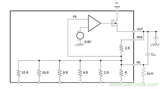 電阻器在這里設(shè)置為 2.R,增益電阻器可以選擇。此外,增益電阻器還可進(jìn)行二進(jìn)制加權(quán)。如果將阻值為 R 的增益電阻器連接至接地,那參考電壓的增益就將為 1+(2.R)/R=3,輸出將調(diào)節(jié)為 0.8V ×3= 2.4V。