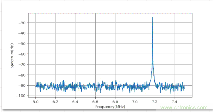 使用DSA815頻譜儀,加上單圈環形天線接收到的特斯拉線圈工作頻譜對應的頻譜如下。其中諧振諧振頻譜為6.8225MHz。