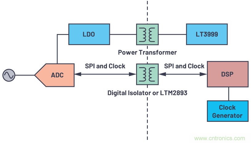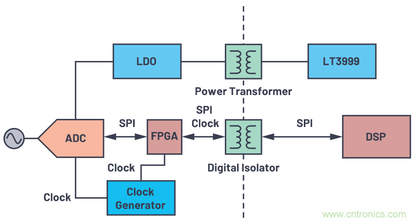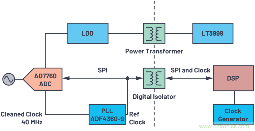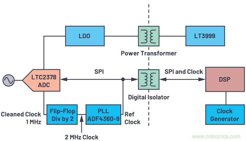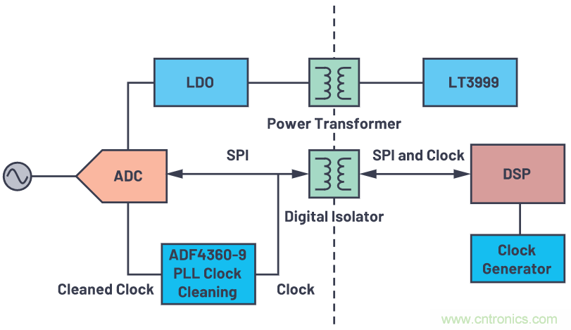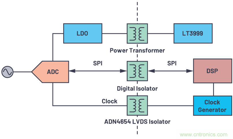 【導讀】如何為ADC增加隔離而不損害其性能?對于隔離式高性能ADC,一方面要注意隔離時鐘,另一方面要注意隔離電源。