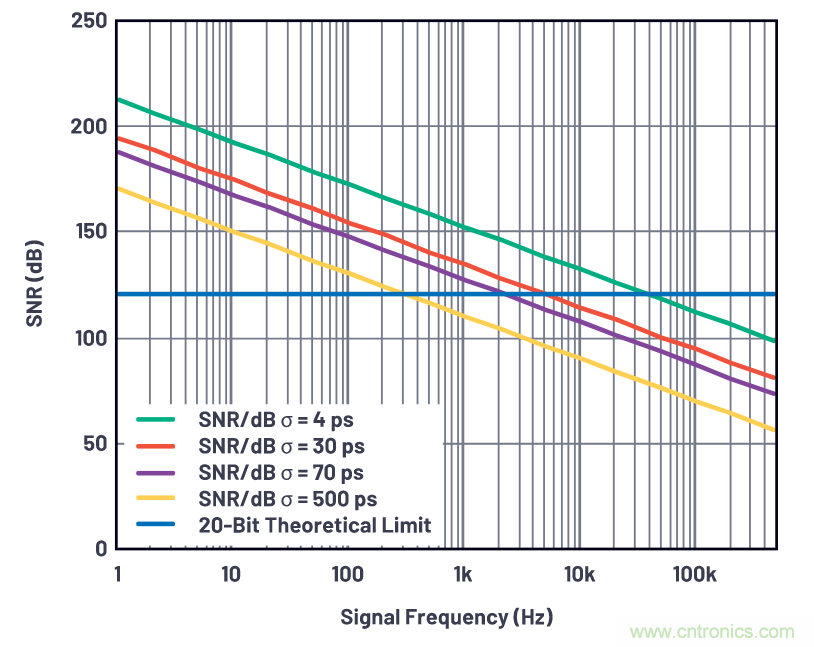 圖7.時鐘抖動與ADC性能的關(guān)系。
