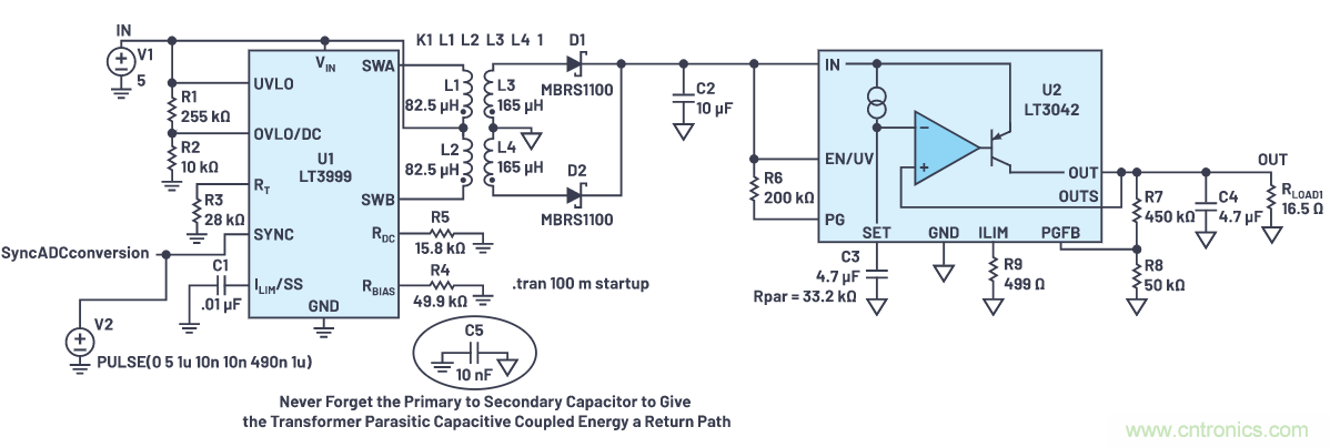 還有其他電磁輻射騷擾較低的隔離電源架構(gòu)。就輻射而言,推挽式轉(zhuǎn)換器比反激式轉(zhuǎn)換器更合適。像 LT3999 這樣的推挽式穩(wěn)壓器提供了與ADC時鐘同步的可能性,有助于實現(xiàn)高性能。圖4顯示了隔離電源電路中的LT3999與ADC采樣時鐘同步的情況。請記住,初級到次級電容為開關(guān)噪聲提供了一個避免共模噪聲效應(yīng)的返回路徑。該電容可以在PCB設(shè)計中利用重疊的頂層平面和第二層平面實現(xiàn),以及/或者利用實際電容實