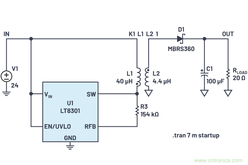 圖2顯示了變壓器L1和L2中的電流。在初級(L1)和次級(L2)繞組中,電流在短時間內(nèi)從高值跳變?yōu)榱恪k娏骷夥蹇梢栽趫D3的I(L1)/I(L2)跡線中看到。電流和能量在初級電感中累積,當開關(guān)斷開時,它們被傳輸?shù)酱渭夒姼校a(chǎn)生瞬變。需要降低開關(guān)噪聲效應(yīng)導致的瞬變,因此,設(shè)計中必須插入緩沖器和濾波器。除了額外的濾波器之外,反激拓撲的另一個缺點是磁性材料的利用率低,而所需的電感較高,因此變壓器較大。此外,反激式轉(zhuǎn)換器的熱環(huán)路也很大,不易管理。有關(guān)熱環(huán)路的背景信息,請參閱 應(yīng)用筆記AN139。