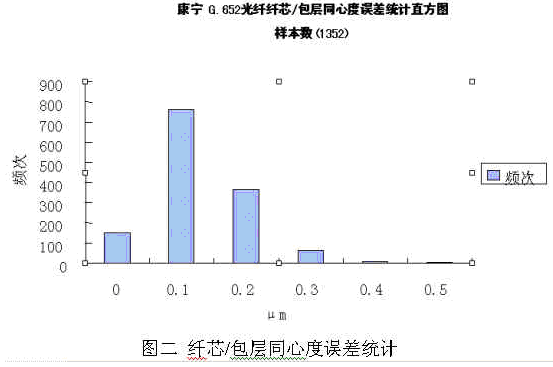 對于原材料之一的緊套光纜及光纖,成都康寧光纜全部采用美國康寧產(chǎn)光纖,依托康寧公司全球領(lǐng)先的光纜制造技術(shù),制造出國內(nèi)領(lǐng)先水平的緊套光纜,并用之于本公司的連接器跳線的生產(chǎn),確保光纖光纜原材料的品質(zhì)。圖二和圖三即是本公司采用的康寧公司G652光纖的主要特性參數(shù),其纖芯/包層同心度誤差和衰減系數(shù)統(tǒng)計值均遠(yuǎn)好于國內(nèi)相關(guān)行業(yè)標(biāo)準(zhǔn)的要求(行業(yè)標(biāo)準(zhǔn)的要求分別為≤0.5μm和≤0.5dB/km):