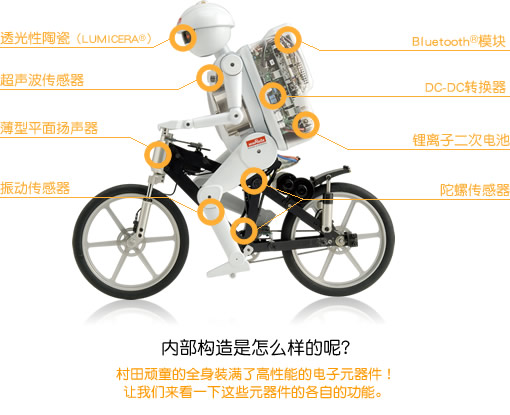 村田制作所在本屆高交會上展示了會騎單車的小機器人——村田頑童,每次演示都吸引了大量觀眾。村田頑童是村田制作所2005年發布的,至今已經3周歲,但是他那精湛的騎單車技術仍然吸引了眾多觀眾的駐足。