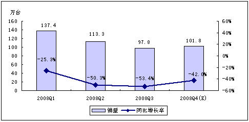 MP3市場(chǎng)各季度銷(xiāo)量同比去年均呈現(xiàn)較大幅度的下滑。2008年第一季度,MP3播放機(jī)銷(xiāo)量比去年同期增長(zhǎng)-25.3%,第二季度銷(xiāo)量同比增長(zhǎng)-50.3%,第三季度銷(xiāo)量比去年同期增長(zhǎng)了-53.4%。