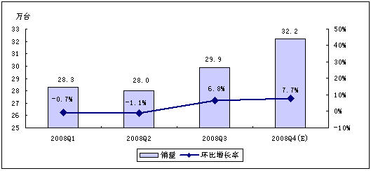 2008年中國(guó)MP3市場(chǎng)銷(xiāo)售量及環(huán)比增長(zhǎng)率