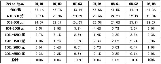 2、中低端MP3市場(chǎng)占據(jù)絕對(duì)主力,800元以下的機(jī)型超過(guò)90%