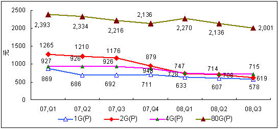 2007年Q1-2008年Q3中國(guó)PMP播放機(jī)市場(chǎng)主要容量產(chǎn)品價(jià)格走勢(shì)