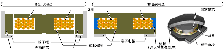 - NR 系列采用了混入鐵氧體粉末樹脂的成型技術,只使用了鼓型磁芯形成了無袖構造產品