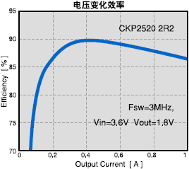 在一定條件下,決定的與降壓型DC-DC轉換器開關頻率相對應的電感值。開關頻率為300kHz 的情況下,需要的是角形4mm,厚度1.8mm 或是角形6mm,厚度為1.2mm的電感。開關頻率提升為1.5MHz 時,角形3mm 厚度為1mm 電感的使用成為可能,電感的小型化也就得以實現。