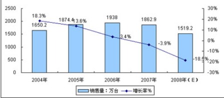 根據賽迪顧問統計數據顯示,2008年1-10月中國DVD播放機市場共銷售DVD播放機1109.2萬臺,實現銷售收入55.3億元。下半年,DVD市場略有回暖,預計2008年銷售額將達1519.2萬臺,同比下降18.5%,而銷售收入達76.6億元,同比下降20.8%。2004-2008年中國DVD播放機市場銷售量復合增長率為1.17%,銷售額復合增長率為-5.1%。