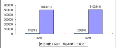 近年以來,全球DVD播放機市場呈現相對飽和、增長放緩。席卷全球的金融風暴,高額的核心技術專利費,人民幣的升值,原材料價格持續上漲和勞動力價格的上升等因素使國產DVD低成本的出口優勢逐步減弱,因此,2008年1-10月DVD播放機出口市場呈現“量降價漲”的趨勢,2008年1-10月出口為10988.59萬臺,同比下降6%,出口額為510034萬美元,同比增長1.1%。出口仍以OEM加工為主。