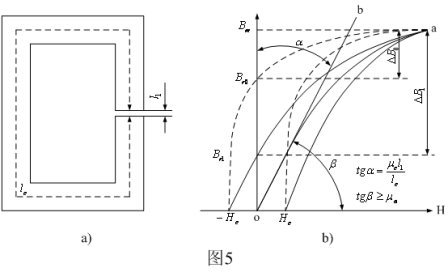 圖5-b) 中,虛線是沒(méi)留有氣隙變壓器鐵芯的磁化曲線,實(shí)線是留有氣隙變壓器鐵芯的磁化曲線;曲線b是留有氣隙變壓器鐵芯的等效磁化曲線,其等效導(dǎo)磁率,即曲線的斜率為 ;