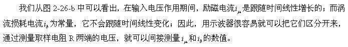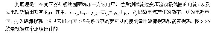 因此,(2-81)、(2-82)、(2-83)、(2-84)式最好只用于對(duì)正激式輸出的單激式開(kāi)關(guān)電源變壓器進(jìn)行磁滯損耗和渦流損耗功率測(cè)試,因?yàn)槠涑跫?jí)線圈的電感相對(duì)比較大,勵(lì)磁電流比較小;如果需要對(duì)反激式輸出的單激式開(kāi)關(guān)電源變壓器進(jìn)行測(cè)試,最好只用于對(duì)小功率開(kāi)關(guān)電源進(jìn)行對(duì)比測(cè)試。