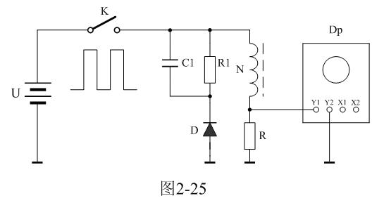 圖2-25中,U是電源電壓,通過(guò)控制開(kāi)關(guān)K不斷地接通和關(guān)斷,就可以把電源電壓調(diào)制成單極性電壓脈沖;N為變壓器初級(jí)線圈,D為反激輸出整流二極管;R1為反激輸出負(fù)載電阻;C1為濾波電容;R為取樣電阻,通過(guò)測(cè)量R兩端的電壓,就可以知道流過(guò)變壓器初級(jí)線圈的電流;取樣電壓被送到示波器Dp進(jìn)行顯示。