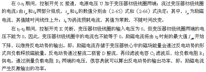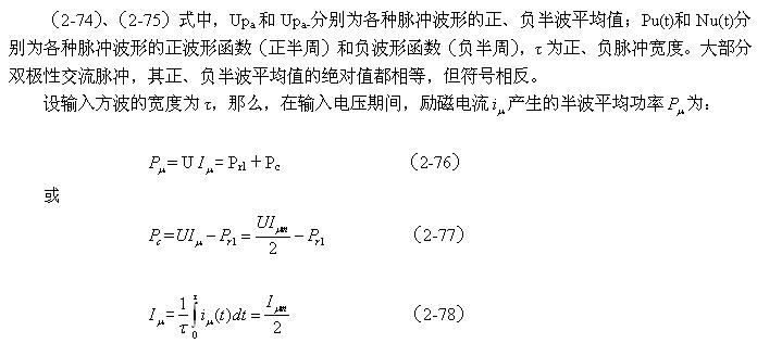 順便指出:(2-84)式的結(jié)果,是認(rèn)為渦流損耗在t1-t2期間(圖2-26-b)完全等于0而求得的,但實(shí)際上,在t1-t2期間變壓器初級(jí)線圈產(chǎn)生的反電動(dòng)勢(shì)同樣也會(huì)在變壓器鐵芯中感應(yīng)產(chǎn)生渦流損耗電流,即當(dāng)輸入電壓為0時(shí)刻,在變壓器鐵芯中還存在很短暫時(shí)間的渦流損耗;由于這種渦流損耗是由反電動(dòng)勢(shì)提供能量來(lái)維持的,它將隨著反電動(dòng)勢(shì)能量的衰減很快就衰減到0。