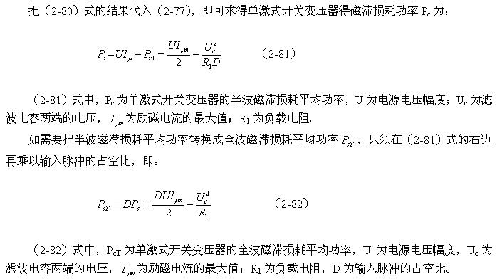 從(2-81)式和(2-82)式還很難看出,單激式開(kāi)關(guān)電源變壓器的磁滯損耗主要與誰(shuí)相關(guān),因?yàn)榈仁接疫叺臏p數(shù)和被減數(shù)與輸入電壓、脈沖寬度都有相同變化的趨向。實(shí)際上在脈沖寬度固定的情況下,單激式開(kāi)關(guān)電源變壓器的磁滯損耗是很小的,此結(jié)果在《開(kāi)關(guān)電源變壓器磁滯損耗分析》的章節(jié)中已經(jīng)分析過(guò)。