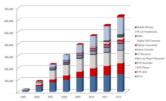 圖2 2005年~2012年預計HDMI裝置出貨量