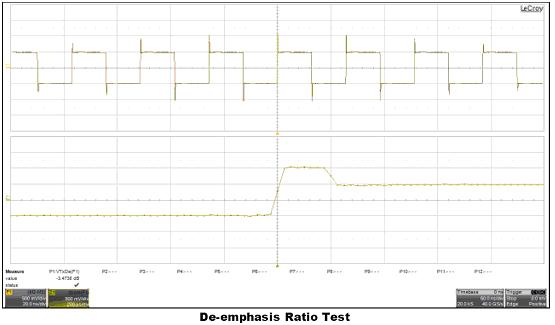 為了把5Gbps速率的數據傳送較遠的距離,USB3.0的發(fā)送端使用了去加重技術,這項測試可以測量DUT的去加重程度是否滿足規(guī)范要求(要求在-3dB到-4dB之間)。測試時DUT發(fā)送出CP7碼流,CP7碼型由50-250個連續(xù)的1和50-250個連續(xù)的0重復交替組成,而且是添加了去加重的信號波形。圖3為某USB3.0芯片的去加重測量結果,該芯片采用了-3.47dB的去加重。