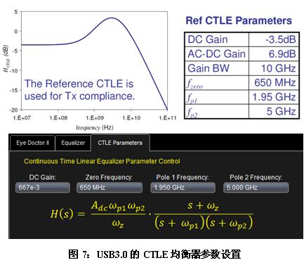 USB的官方組織規(guī)定了USB3.0使用的CTLE均衡器的參數,如下圖7左上部分為均衡器的頻響,右上方的表格是均衡器的參數,下方是力科示波器中集成了USB3.0的均衡器參數,可方便調用。
