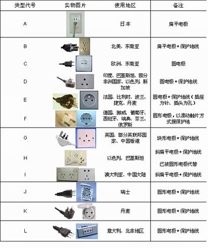 交流電墻壁插座的歷史不過80年,此間隨著用電量、用電經驗與事故教訓的增加,由于技術、安全性、經濟性等因素,加之地理、歷史、政治等原因,世界各地在發展民用電器供電裝置時,并沒有采用美國最初的插座設計而形成了不同標準,使得墻壁插座形式多種多樣。美國商務部統計了全球常見電源插頭/座(表2.1)樣式,并以字母進行了分類。