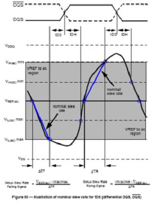 為了在上表中查到對應的修正值,需要首先得出相應信號的斜率。JEDEC標準規定了兩種斜率計算方法,即直連斜率norminal slew rate和切線斜率tangent slew rate,分別在不同數據波形時采納。兩種斜率計算方法如下圖所示。