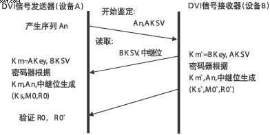 HDCP具體工作過(guò)程:首先由主機(jī)發(fā)送密鑰選擇導(dǎo)引序列(AKSV)和64bit偽隨機(jī)序列(An)到接收方,接收方回傳密鑰選擇導(dǎo)引序列(BKSV)和轉(zhuǎn)發(fā)器位(REPEAT-bit)(如是轉(zhuǎn)發(fā)器用以表示身份),發(fā)送方確認(rèn)BKSV是否已被廢除和是否包含20個(gè)1和20個(gè)0;如果雙方的設(shè)備密鑰和KSV有效,則計(jì)算產(chǎn)生一個(gè)56bit的公共密鑰Km和Km`,然后可產(chǎn)生KS、KS`(傳輸密鑰)、M0、MO`(64bit后續(xù)驗(yàn)證用追加初始序列)、RO、R0`(16bit指示驗(yàn)證成功,它必須在AKSV發(fā)送后100ms內(nèi)傳回發(fā)送方;驗(yàn)證成功后R01和R0相等;每128幀修正一次,每2s回傳一次)。因此當(dāng)DVI接口中斷傳輸2s以上,或是非授權(quán)設(shè)備接收時(shí),主機(jī)將停止傳輸內(nèi)容,以達(dá)到保護(hù)傳輸內(nèi)容的目的。HDCP鑒定處理過(guò)程如圖6所示。