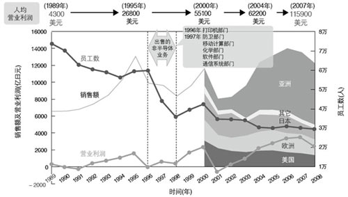 在這一巨大的轉變過程中,TI公司的營收也發生著變化。雖然1995年后營收出現縮減,但隨著DSP/模擬業務規模的不斷擴大,到2006~2007年,公司的營收便超過了變革以前的水平。尤其值得特別一提的是,公司員逐年減少,員工人均營業利潤的增長卻異常迅速,從1989年的人均4300美元、1995年的2。68萬美元,增長到了2007年的11。59萬美元,在l8年間增長了27倍,1995年~2007年的12年間也增長了4倍多。而且,公司在半導體業的排名也從1995年的第7位提升到了近年很穩定的3~4位。