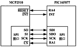 其中,SCK為SPI總線時鐘,PIC16F87x模塊的SPI接口接MCP2510的SI、SO、SCK,RA4與RA1分別控制MCP2510的芯片復位和片選。INT接受MCP2510的中斷請求。