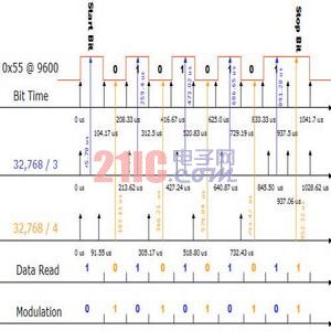 UART數據用10,922波特或8,192波特的UART接收。由于UART在傳輸中間點對數據進行采樣以補償抖動,因此該點已經被選擇為接收UART的采樣點。在沒有行抖動的理想情況下,10,922波特UART對第三數據位的開始兩次讀數都會是錯誤的而8,192波特的UART由于會完全遺漏第三位,很快就將出錯。由于低功耗應用的理想時鐘是低功耗實時時鐘模式,這使得在低功耗環境中處理很困難。解決這一問題的最好辦法就是將µC與調制技術結合使用,用32kHz振蕩器提供非常精確的2,400波特,并完全能支持9,600波特(參見圖3)。