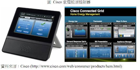 在綠色節能觀念的日益普及趨勢下,有效管理家中用電的家庭能源管理(Home Energy Management,HEM)成為智慧電網公共建設外,另一項具備高度發展潛力的市場領域。面對民眾對節能管理的需求,現階段陸續已有許多國際大廠投入相關應用與服務的研發;除了Google推出PowerMeter的用電監測網路平臺外(需搭配智慧電表或插座等設備),Cisco與Intel也陸續搭上平板電腦熱潮,推出協助民眾管理家庭用電的HEM裝置。相較于Google PowerMeter,Cisco與Intel所推出產品是以物聯網(Internet of Things,IoT)概念為基礎,透過無線網路模式連結家中各項電器設備,進行用電資訊的傳遞與監控,同時進行遠端遙控動作。 Cisco推出包含家庭能源控制器(Home Energy Controller,HEC)與能源管理服務平臺的家庭能源管理解決方案(Home Energy Management Solution,HEMS),作為進入家庭節能市場的第一步。 HEC如同家庭中的監控中心,除了可以在螢幕上即時顯示家中用電的即時狀態資訊外,使用者透過觸控面板的HEC還可以對連線的家電產品進行操控,決定是否關閉或調整特定家電來節省電力消耗。