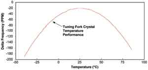 溫度的不穩定和相應的溫度系數是許多應用所面臨的問題,特別是那些工作在寬溫范圍的應用,如室外電表或水表。標準的用作RTC時基的32.768kHz音叉晶體的頻率響應與溫度之間的關系為Δf/f=k(T-T0)2+f0。其中,Δf為頻率偏差,f為基頻,k為曲率,T為溫度,T0為折點溫度,f0為折點溫度處的頻偏。