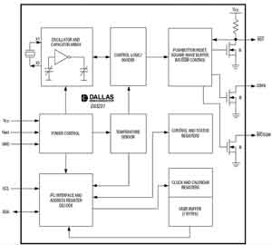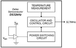 本節將以Maxim公司的DS32kHz溫補晶體振蕩器為例,介紹通過改變晶體負載電容修正由于溫度變化產生的頻偏的概念,如圖2所示,Maxim的這項內部校準技術還獲得了專利。DS32kHz可以作為大多數系統的32kHz輸入,如RTC或內置RTC的微控制器。