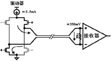 一個簡單的LVDS傳輸系統(tǒng)由一個驅(qū)動器和一個接收器通過一段差分阻抗為100Ω的導(dǎo)體連接而成,如圖1所示。驅(qū)動器的電流源(通常為3.5mA)來驅(qū)動差分線對,由于接收器的直流輸入阻抗很高,驅(qū)動器電流大部分直接流過100Ω的終端電阻,從而在接收器輸入端產(chǎn)生的信號幅度大約350mV。通過驅(qū)動器的開關(guān),改變直接流過電阻的電流的有無,從而產(chǎn)生“1”和“0”的邏輯狀態(tài)。在有些最新生產(chǎn)的LVDS接收器中,100Ω左右的電阻直接集成在片內(nèi)輸入端上了,如MAXIM公司的MAX9121/9122等。