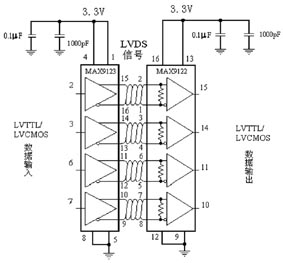 圖2是采用MAXIM公司的一片MAX9123驅(qū)動器和一片MAX9122接收器設(shè)計(jì)的一個4通道LVDS點(diǎn)對點(diǎn)連接的單工接口。該接口工作電源為+3.3V,驅(qū)動器輸入和接收器輸出數(shù)據(jù)為LVTTL/LVCMOS電平。